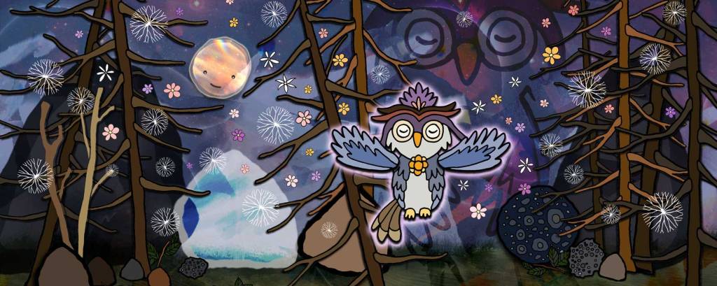 Wise Old Owl is the elder who watches over the Everlasting Forest and its Forest Friends. Wise Old Owl is a horned-owl (Bubo) with a violet lotus flower on its head. The lotus represents enlightenment and connection to all three worlds of existence (lower world, middle world, and upper world) Owl appears out of nowhere as a silent watcher and protector of the Forest Friends as they travel around the world. Wise Old Owl will silently intervene to help the Forest Friends by calling upon Misty Moonbeam, Solar Firefox and Little Light Bear. Owl remembers everything, and sees everything from an enlightened point of view. A flower blossom appears on Owl’s chest as a symbol of its big, open heart.