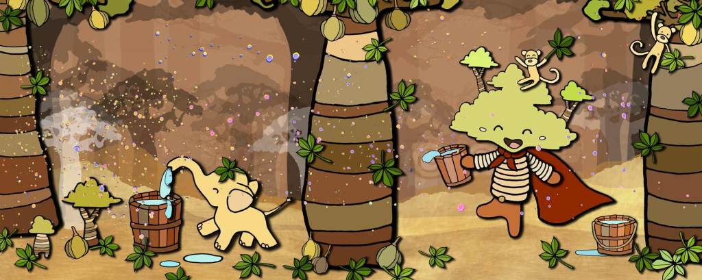 Storyline: Bountiful Baobab invites Truthful Tea Leaf and Blissful Bodhi to an overnight adventure in Africa. When Tea Leaf and Bodhi arrive, they are greeted by Bountiful Baobab and a babbling baboon who is holding baskets of monkey bread fruit. As they eat the fruit, a herd of zebras run by to say hello. After dinner they are introduced to an elder Baobab that has been turned into a cottage with windows that contains two beds. When the sun sets, they hear a lazy lion roaring as it lays down to go to sleep outside their window. During the night Baobab’s flowers open and busy fruit bats begin buzzing around gathering pollen. In the morning they awaken to the sound of eager elephants standing outside their door looking for water. The friends take a short walk and meet a gentle giraffe who plucks a flower for them to smell. A curious cheetah lets them know how lucky they are to have Bountiful Baobab for a friend. An ogling ostrich scratches the ground looking for insects, as hovering honey bees deliver honey for afternoon tea. Soon it’s time for Tea Leaf and Bodhi to return home. All of their new friends gather around the portal to wish them well.