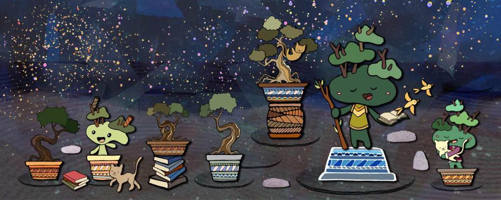 Brave Bonsai is a young Juniper tree about to be planted into a permanent Bonsai container. Bonsai carries a traveling stick made of Rowan (traveler’s tree). Bonsai loves to read books as a way to experience the world beyond container gardens. Two magical goldfinches fly to all the destinations that Bonsai dreams about and share what they see. Bonsai also loves cats and cats love Bonsai.