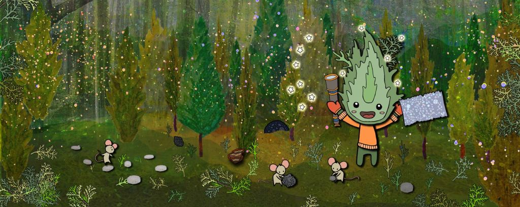 Cosmic Cypress lives on the California coast near its very tall cousins the Redwoods, Sequoias and Thuja. Cosmic cypress is fascinated by the nighttime sky and loves to make wishes on shooting stars. One big wish is to get as close as possible to the stars, but being a smaller tree makes it seem impossible. Cypress uses a telescope to peer through the trees in order to create detailed maps of the galaxy. Little field mice scurry about collecting tiny pinecones and stones to help Cypress imagine the sky on the ground below. The name Cosmic Cypress was inspired by its redwood cousin Hyperion, which is earth’s tallest living tree. In Greek mythology, Hyperion is the Titan God of Light who fathered Helios (sun), Selene (moon) and Eos (dawn).