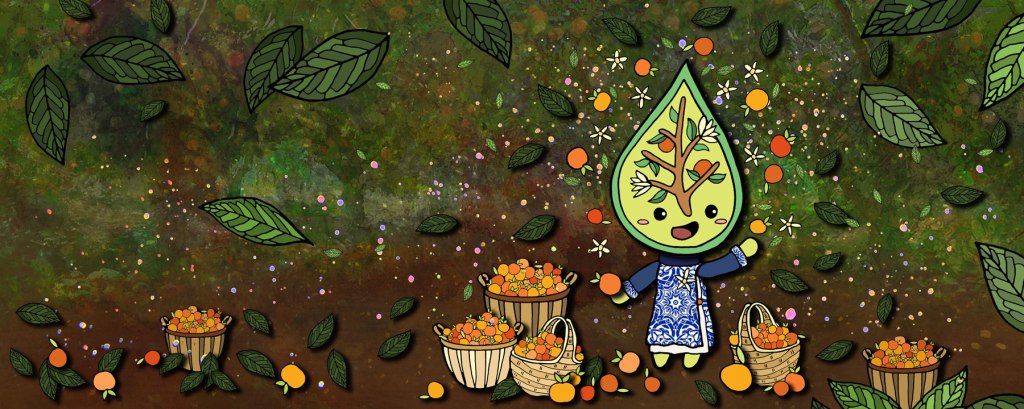 Optimistic Orange lives in a fragrant orange grove in Brazil. Optimistic Orange is creative and carefree and brings laughter and fruits to everyone. Sweet Orange wears an elegant blue and white robe with a Mediterranean pattern. Woven baskets filled with ripe oranges are never far away, because Optimistic Orange loves to pick them up and juggle.